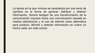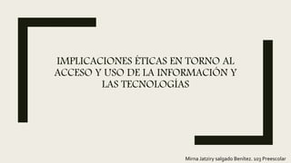 Este documento discute las implicaciones éticas en torno al acceso y uso de la información y las tecnologías. Explica cómo la tecnología ha modificado las actividades y relaciones sociales a través de computadoras y telecomunicaciones. También describe algunas características del acceso a la información a través de medios electrónicos como el fácil acceso a todo tipo de información y la comunicación inmediata. Finalmente, enfatiza la importancia de considerar criterios como el alcance, densidad y confiabilidad de la información para articular la