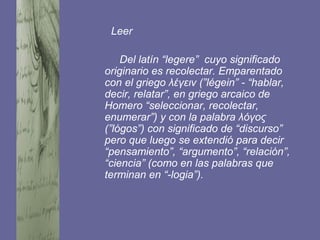 El documento habla sobre el proceso de lectura. Define la lectura como un proceso cognitivo, metacognitivo y perceptual que implica la interacción entre los conocimientos previos del lector y las relaciones intra e intertextuales presentes en el texto. Explica que la lectura requiere reconocer la lógica y pertinencia de las partes del texto. También discute los objetivos, tipos y niveles de lectura, así como estrategias cognitivas que promueven la comprensión lectora.