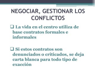 Este documento describe los tipos de conflictos que pueden surgir en un centro educativo y cómo gestionarlos de manera efectiva. Explica que los conflictos son inevitables y pueden tener diversos orígenes como malentendidos u omisiones. Recomienda que el director intervenga para dirigir reuniones donde se expongan las causas del desacuerdo y se implique a todas las partes para llegar a una solución conjunta a través de la negociación o la mediación de manera paciente, justa y escuchando a todos.