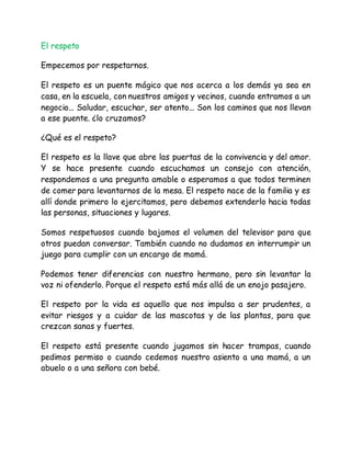 Este documento presenta una serie de valores positivos como el amor, el respeto, la amabilidad, la amistad, la generosidad, la honestidad, la perseverancia, la prudencia, la responsabilidad, la superación y la tolerancia. Define cada valor y ofrece ejemplos de cómo se manifiestan en las acciones y comportamientos de las personas. El objetivo general es enseñar a los niños la importancia de practicar estos valores para tener relaciones interpersonales saludables y contribuir positivamente a la sociedad.