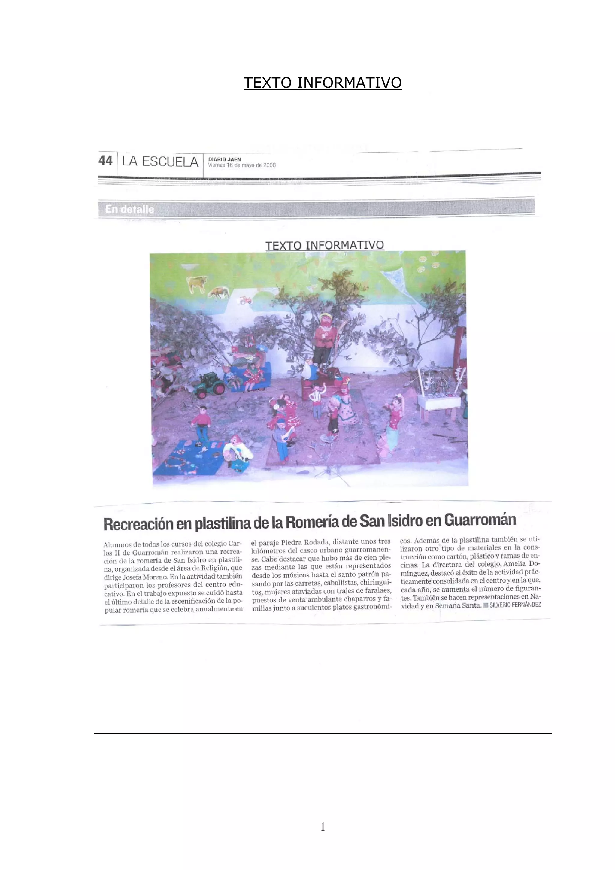 Los alumnos de un colegio en Guarromán representaron la romería de San Isidro que se celebra anualmente en el paraje Piedra Rodada. Los niños recrearon con sus disfraces y accesorios los elementos propios de esta popular fiesta religiosa campestre dedicada a una imagen del santo. El artículo informa sobre esta actividad educativa organizada por la maestra de Religión Católica para dar a conocer las tradiciones locales.