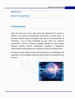 El documento describe las teorías del aprendizaje cognitivismo. Explica que el cognitivismo analiza los procesos mentales como la percepción, memoria, lenguaje y razonamiento para comprender el comportamiento humano. También describe las características del cognitivismo como que el sujeto procesa activamente la información y que estudia las representaciones mentales. Finalmente, resume las contribuciones de teóricos clave como Piaget, Vigotsky, Bruner y Ausubel.