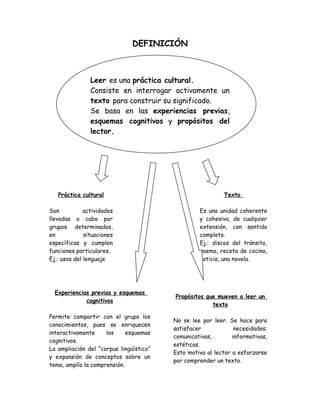 Este documento describe diferentes enfoques y concepciones sobre la lectura. Según el enfoque tradicional, la lectura consistía en un conjunto de habilidades que había que enseñar, como decodificar y encontrar la idea principal. La concepción actual ve la lectura como un proceso más activo donde el lector construye el significado del texto basándose en sus experiencias previas y propósitos. El documento también discute estrategias para activar los conocimientos previos del lector y mejorar la comprensión, como hacer preguntas antes y después de leer.