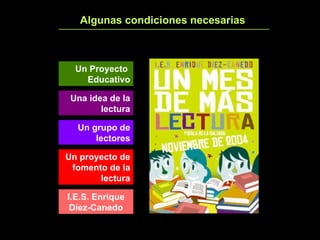 El documento describe un proyecto para fomentar la lectura en un instituto español. Propone crear experiencias positivas para los estudiantes en cinco ámbitos: una experiencia lectora personal agradable, valorada, compartida y social. También sugiere evaluar el proyecto midiendo la participación en actividades relacionadas y el préstamo de libros.