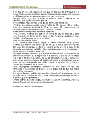 El Hombre que Calculaba, Beremiz Samir, ayuda a resolver la disputa de tres hermanos árabes sobre cómo repartir justamente 35 camellos que heredaron según las instrucciones de su padre. Beremiz propone añadir el camello del narrador para hacer 36 camellos y reparte 18 camellos al hermano mayor (mitad), 12 al segundo (un tercio) y 4 al menor (una novena parte), ganando cada hermano más de lo estipulado originalmente y quedándose Beremiz con el camello restante como pago por su solución,