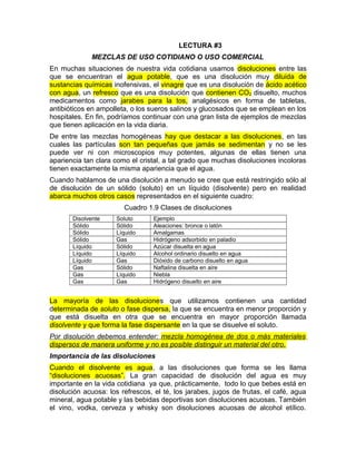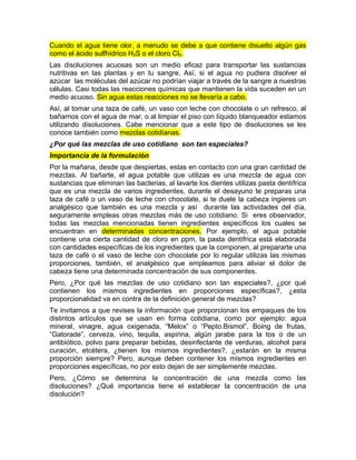 El documento describe diferentes tipos de mezclas de uso cotidiano o comercial, incluyendo disoluciones acuosas como el agua potable, el vinagre y los refrescos. Explica que las disoluciones son mezclas homogéneas en las que las partículas del soluto son tan pequeñas que no se pueden ver, y da ejemplos como el azúcar disuelta en agua. También señala que la concentración de una disolución, expresada como porcentaje en masa o volumen, es importante para caracterizarla y comparar