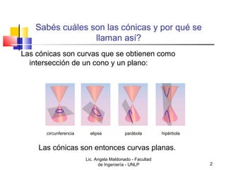 1) El documento trata sobre las cónicas, curvas planas obtenidas al cortar un cono circular recto con un plano. Describe cómo trazar circunferencias, parábolas, elipses e hipérbolas.