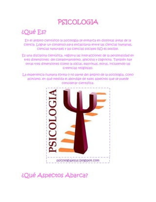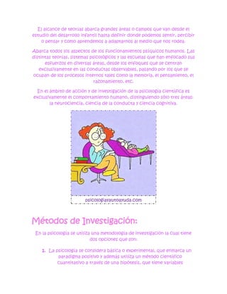 La psicología es una disciplina científica que estudia el comportamiento y la mente humanos. Abarca aspectos como el desarrollo infantil, los procesos mentales como la percepción y el aprendizaje, y las teorías incluyen el psicoanálisis, conductismo y cognitivismo. Utiliza métodos de investigación tanto cuantitativos como cualitativos. Algunas áreas de estudio son la psicología evolutiva, del aprendizaje, clínica y social.