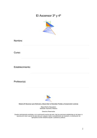 Este documento presenta una introducción al libro "El Ascensor 3o y 4o" que contiene actividades para estimular la velocidad, fluidez y comprensión lectoras. Explica conceptos clave como los movimientos oculares durante la lectura y fisiología del proceso lector. Recomienda aplicar sesiones diarias de 30 minutos en el aula y lectura en casa con el apoyo de apoderados para mejorar las habilidades lectoras a través de la práctica regular.