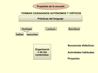 El documento describe las prácticas del lenguaje en el contexto escolar, incluyendo la oralidad, lectura, escritura y proyectos. Explica que estas prácticas deben vincularse con otras asignaturas como ciencias sociales, considerando principios como el cambio y la multicausalidad. También describe operaciones como leer para estudiar, tomar notas y compartir conocimientos construidos a través de exposiciones orales o escritas.