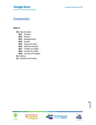 Este documento proporciona una introducción a las hojas de cálculo de Google Docs. Explica cómo crear una nueva hoja de cálculo, el entorno de trabajo, cómo desplazarse por la hoja, guardar datos, ingresar y seleccionar datos, trabajar con celdas, e insertar y formatear celdas.