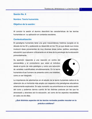 Este documento describe las teorías humanistas del aprendizaje y la instrucción. Señala que la teoría humanista ve al ser humano como una totalidad en continuo desarrollo. Propone que la educación debe centrarse en el estudiante, considerando sus necesidades y permitiéndole tomar decisiones autónomas. Algunos principios clave son que los estudiantes aprenderán mejor lo que quieren conocer, que saber cómo aprender es más importante que la información, y que la autoevaluación es la única evaluación significativa.