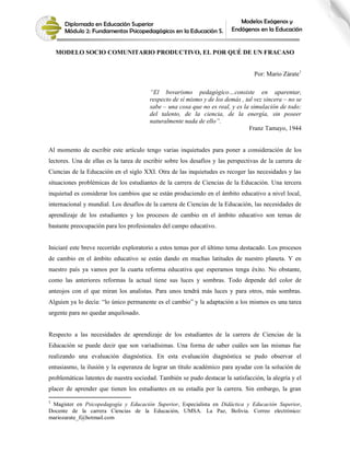 Este documento discute el posible fracaso inminente del Modelo Socio Comunitario Productivo (MSCP) que se aplica actualmente en el sistema educativo de Bolivia. Señala varias razones para este posible fracaso, incluyendo la falta de coordinación con las carreras de Ciencias de la Educación, los gobiernos municipales y las empresas privadas. También critica el enfoque adoctrinador del programa de formación de maestros y argumenta que los principios del MSCP ya no son coherentes con el contexto actual e internacional. Concluye que