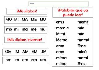 El documento presenta una lista de palabras que contienen la consonante "m", incluyendo nombres propios y frases cortas. También incluye sílabas con "m" en orden normal y reverso para practicar la lectura. Finalmente, pide identificar palabras de una oración e ilustrarlas.