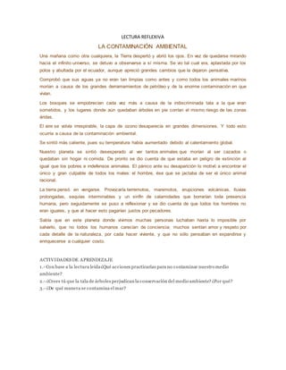 La Tierra se despertó y observó que sus aguas ya no eran limpias y los animales marinos morían debido a derrames de petróleo y contaminación. Los bosques se empobrecían por tala indiscriminada y el aire se volvía irrespirable mientras la capa de ozono desaparecía, todo debido a la contaminación ambiental causada por los humanos. La Tierra se sintió en peligro de extinción al igual que los animales debido a la caza y la pérdida de hábitat, culpando al hombre por todos los