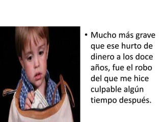 Este documento narra la historia de un niño que robó una parte del brazalete de oro de su hermano. El niño se sintió culpable y decidió confesar su falta a su padre enfermo por escrito. Cuando el padre leyó la carta, lloró al ver el sufrimiento de su hijo. Aunque el padre sufría, perdonó a su hijo lavando su culpa y enseñándole el verdadero valor del amor paternal.