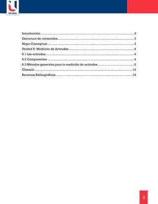 Este documento presenta información sobre la medición de actitudes. Explica que las actitudes están compuestas de tres componentes: cognitivo, afectivo y de comportamiento. Luego describe los métodos más utilizados para medir actitudes, incluyendo encuestas, observación, y nuevas técnicas de neuromarketing. Finalmente, provee detalles sobre cómo implementar encuestas y observaciones, y las herramientas disponibles para analizar los datos recopilados.