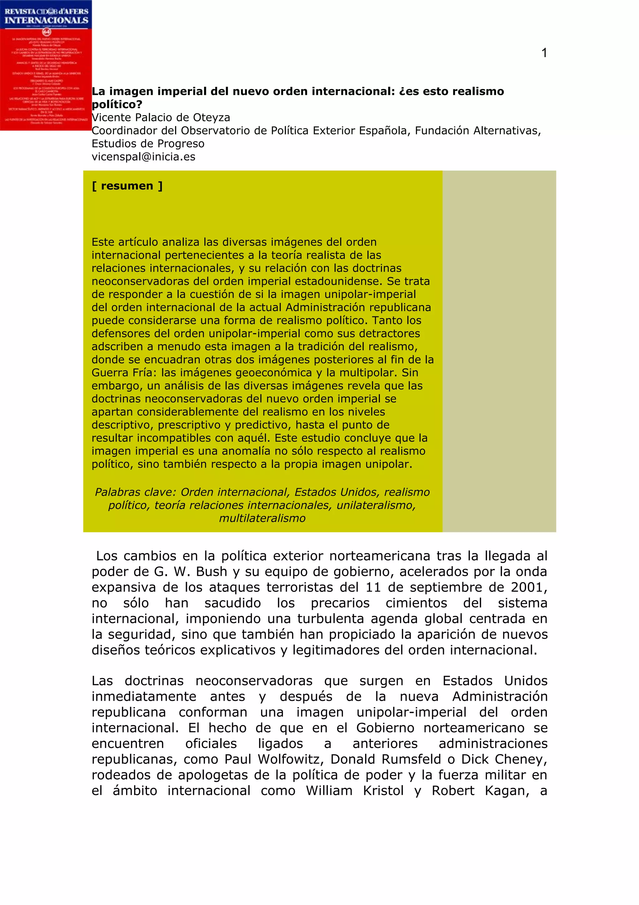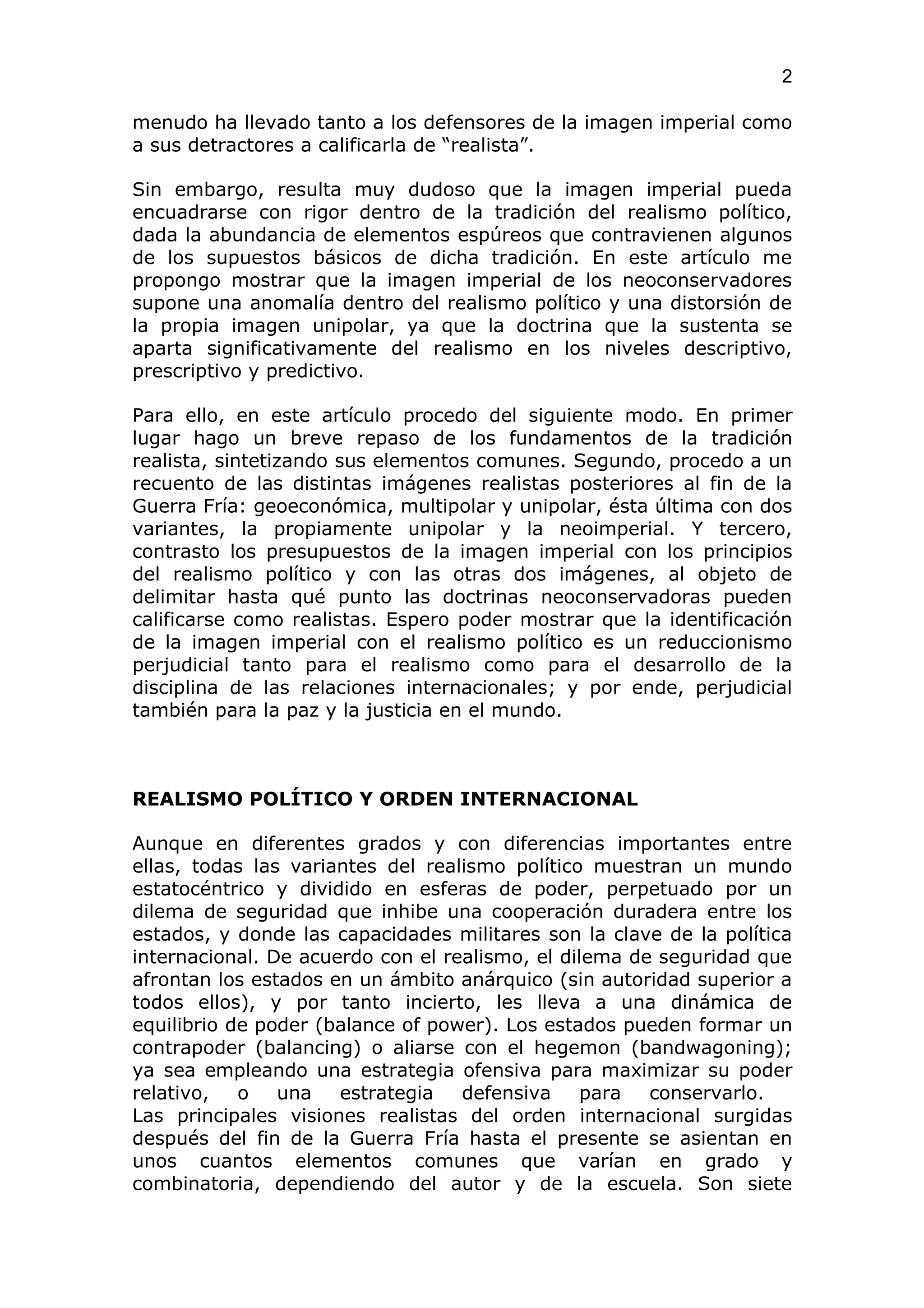 Este artículo analiza las diferentes visiones del orden internacional según la teoría realista de las relaciones internacionales y su relación con las doctrinas neoconservadoras estadounidenses que promueven un orden imperial unipolar. El autor argumenta que la visión imperial neoconservadora no puede considerarse realista políticamente dado que se aparta significativamente de los principios descriptivos, prescriptivos y predictivos del realismo en tres niveles. El artículo revisa las diferentes imágenes realistas posteriores a la Guerra Fría - geoeconómica, multip