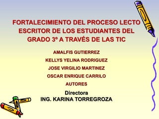 El documento presenta un proyecto pedagógico centrado en el fortalecimiento del proceso lecto-escritor de estudiantes de grado 3 a través de las TIC en una institución educativa en Atánquez, Cesar. Se identifican dificultades como la apatía por la lectoescritura y la falta de dominio en lectura y escritura, y se proponen diversas actividades interactivas que integran el uso de herramientas digitales para motivar a los estudiantes y docentes. La metodología se basa en teorías del aprendizaje activo y constructivista, destacando la importancia de adaptar los recursos tecnológicos y didácticos para mejorar los resultados educativos.