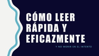 Este documento presenta información sobre cómo leer rápida y eficazmente. Explica que la lectura es un proceso de decodificación de palabras escritas para comprender la información. Luego, describe algunas técnicas de lectura como la lectura silenciosa, en voz alta, secuencial y puntual. Finalmente, ofrece consejos para mejorar la velocidad y comprensión lectora como identificar malos hábitos, ampliar el campo visual y reducir el número de fijaciones por línea.