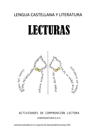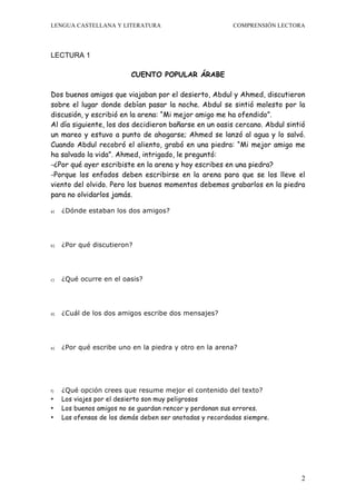 El documento presenta tres lecturas cortas. La primera lectura es un cuento popular árabe sobre la amistad. La segunda lectura describe una ciudad extraña donde las palabras son seres vivos. La tercera lectura trata sobre una abuelita japonesa de 74 años llamada Keiko Wakabayashi que enseña artes marciales a soldados italianos.