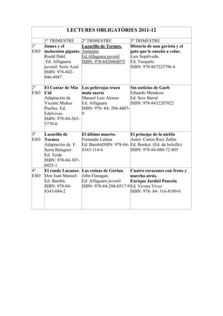 El documento proporciona una lista de lecturas obligatorias para diferentes cursos de educación secundaria en España, incluyendo títulos, autores y editoriales. Se enumeran las lecturas recomendadas para primero, segundo, tercero y cuarto curso de la educación secundaria obligatoria junto con información sobre cada libro.