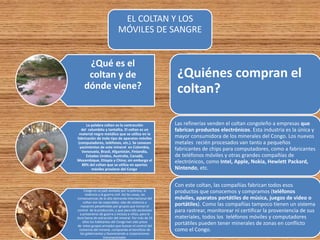 El documento trata sobre varios temas relacionados con el impacto ambiental y social de la tecnología y la industria electrónica. Incluye secciones sobre el coltán extraído en el Congo y su relación con conflictos armados, sobre el comercio electrónico y su importancia económica, sobre los residuos electrónicos y su toxicidad, y sobre las ciudades más contaminadas del planeta.