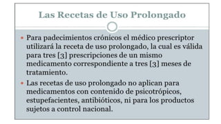 Este documento trata sobre las recetas médicas. Explica que una receta médica es el documento legal mediante el cual los médicos prescriben medicamentos a los pacientes para su dispensación por los farmacéuticos. También describe los elementos clave de una receta médica como el nombre del paciente, médico, medicamento y dosis. Además, cubre temas como la redacción de prescripciones médicas y los requisitos para emitir una prescripción.