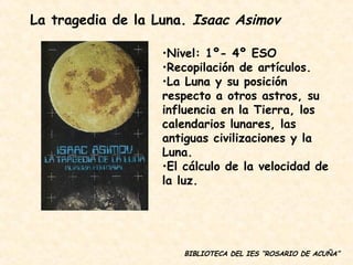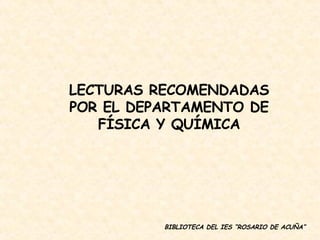 El documento lista lecturas recomendadas por el departamento de física y química de una biblioteca para estudiantes de diferentes niveles educativos. Incluye libros sobre la luna, biografías de mujeres científicas, introducciones a la física para no expertos, historia de la energía nuclear, historia del telescopio, mecánica, historia de la medida del metro, representaciones teatrales de científicos, mecánica cuántica y teoría de la relatividad. Los libros abarcan una variedad de temas