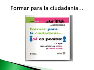 El documento habla sobre la creación de una institución para formar trabajadores en servicios como limpieza, acueducto y alcantarillado, ya que no había expertos en estas áreas. La institución se encargó de desarrollar programas curriculares y herramientas pedagógicas para llevar a cabo la evaluación, formación y certificación de trabajadores bajo un nuevo enfoque colombiano de formación laboral. También discute la importancia de desarrollar competencias ciudadanas a través de la escuela, la familia,