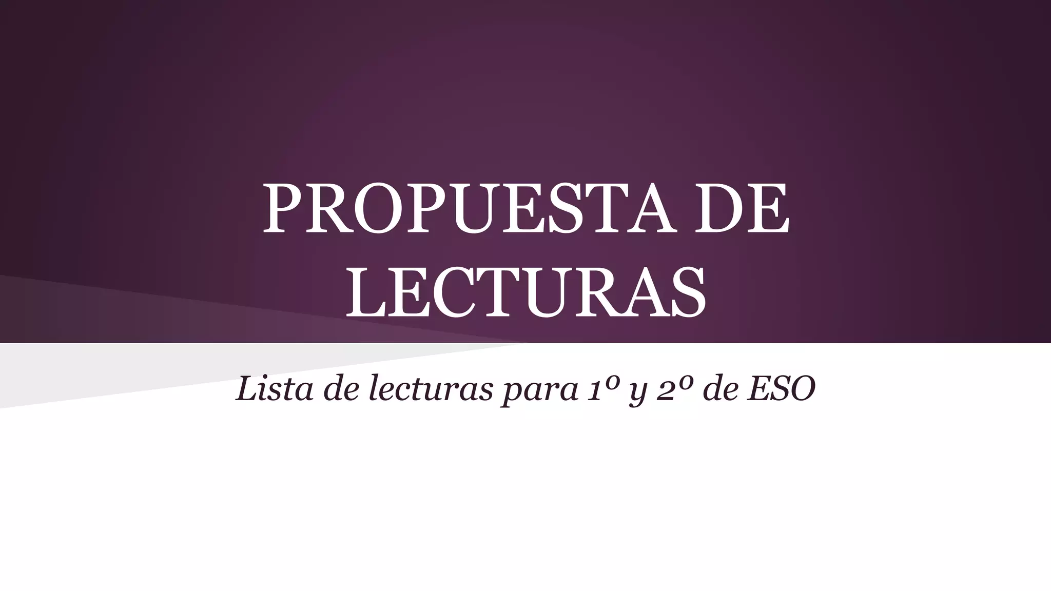 El documento presenta varias propuestas de lectura para estudiantes de 1o a 4o de ESO, incluyendo novelas de misterio, aventuras y amor, obras de teatro, poemas y cuentos que tratan temas como la amistad, el medio ambiente y lo sobrenatural. Las lecturas buscan entretener e involucrar a los estudiantes a través de historias atractivas y de fácil lectura.