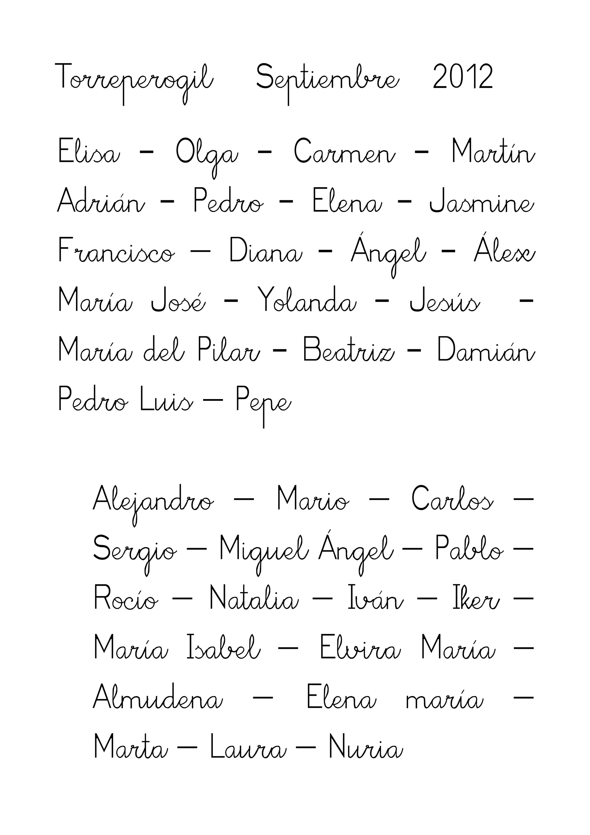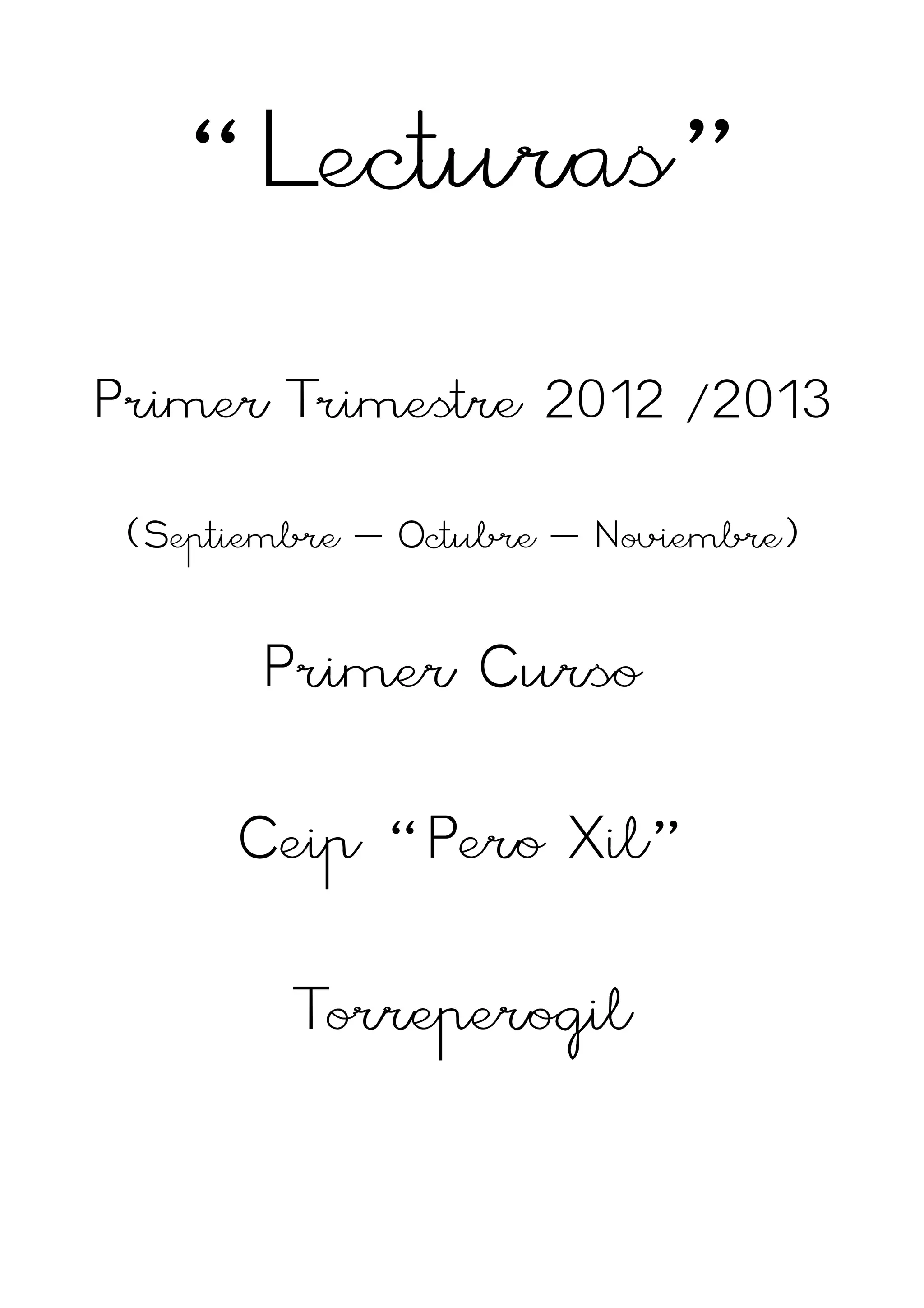 Este documento presenta la lista de lecturas del primer trimestre del curso 2012/2013 para el primer curso del colegio CEIP "Pero Xil" en Torreperogil. Incluye las fechas de septiembre a noviembre y los nombres de los estudiantes.
