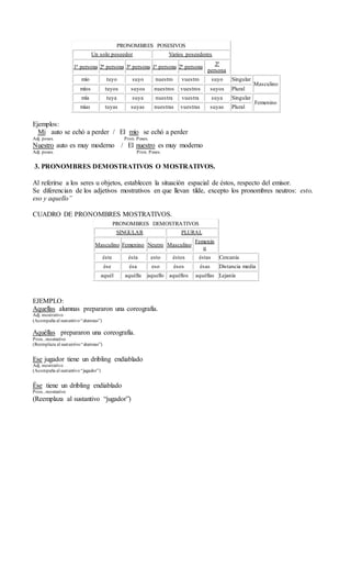 Este documento define y explica diferentes tipos de pronombres en español, incluyendo pronombres personales, posesivos, demostrativos, numerales, indefinidos y relativos. También describe las características principales de los textos literarios como la ficcionalidad, la función estética del lenguaje y la capacidad connotativa. Finalmente, presenta diferentes tipos de mundos literarios como los mundos realistas, míticos, legendarios y fantásticos.