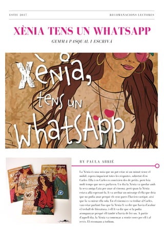 El documento contiene recomendaciones de lectura de varios estudiantes del instituto Hug Roger III. Incluyen resúmenes breves de libros como "Xènia Tens un Whatsapp" de Paula Abrié, "La ràbia" de Lolita Bosch, "La venjança dels criptosaure" de Joan Pla, "El diario de Ana Frank" y recomendaciones de obras como "Harry Potter", "Un mundo feliz" y "Silber". Los estudiantes comparten sus impresiones sobre estas lecturas.