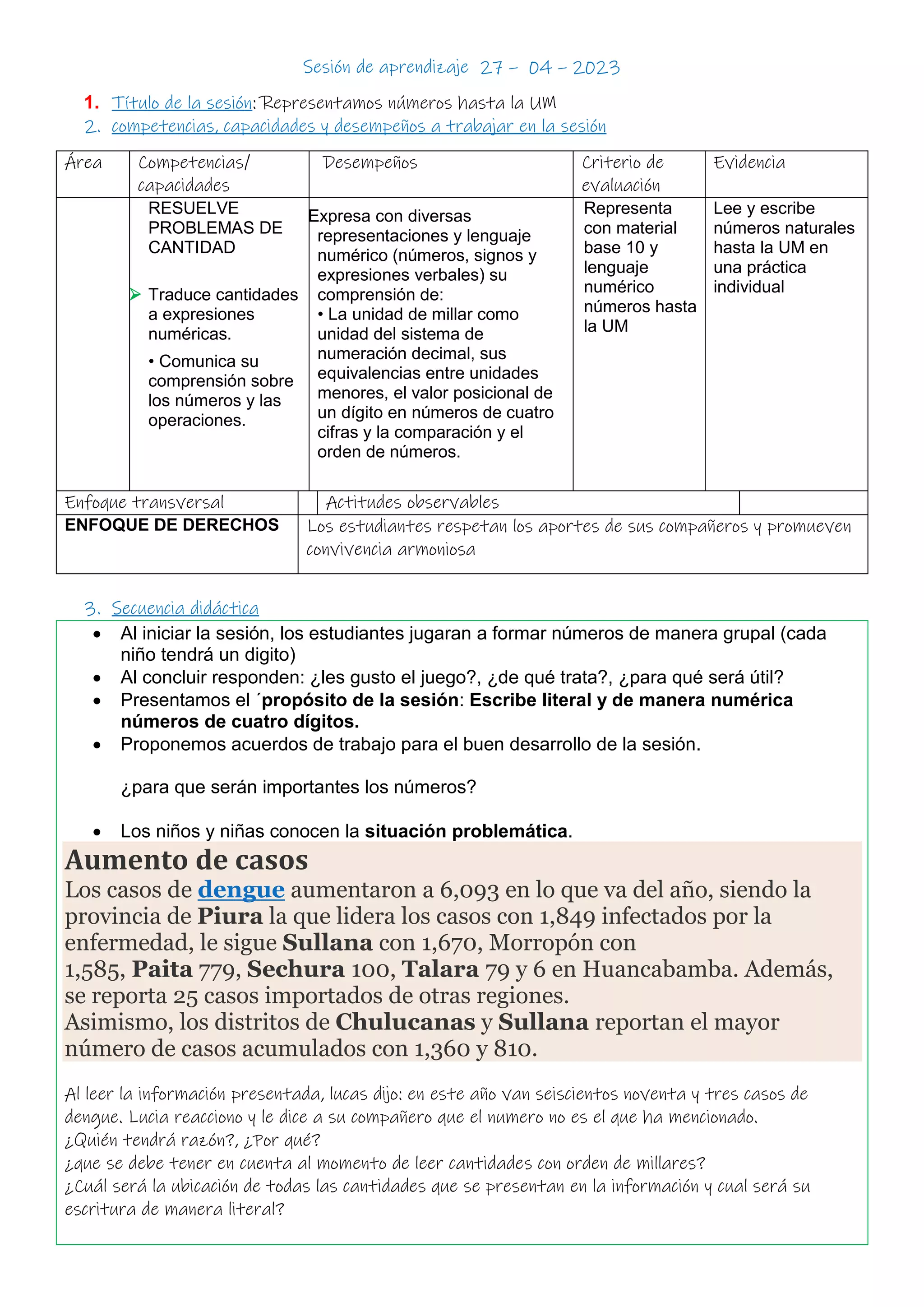 Este documento presenta la secuencia didáctica de una sesión de aprendizaje sobre números hasta la unidad de millar. La sesión comienza con un juego grupal para formar números y luego introduce el propósito de escribir números de cuatro dígitos de forma literal y numérica. Los estudiantes analizan un problema sobre casos de dengue en diferentes provincias peruanas y representan los números en el tablero de valor posicional. Al final, reflexionan sobre lo aprendido y practican representando más números de cuatro dígitos.