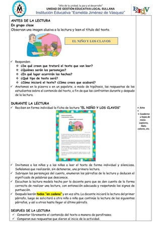 El documento describe una lección en el aula sobre la convivencia pacífica. Los estudiantes leerán un cuento titulado "El niño y los clavos" para descubrir su propósito y reconocer sujetos y predicados. Después de debatir sobre la convivencia, los estudiantes leerán el cuento individualmente y en grupo. Luego responderán preguntas y completarán actividades para evaluar su comprensión.
