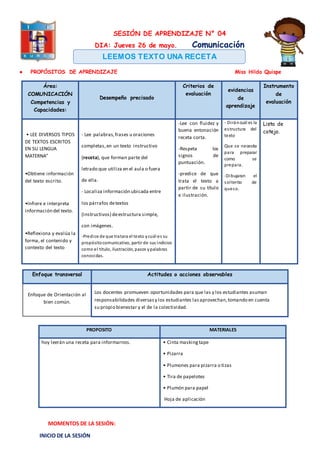 La sesión de aprendizaje se centró en enseñar a los estudiantes sobre los textos instructivos a través de la lectura y análisis de una receta. La maestra guió a los estudiantes en la lectura de una receta para el plato típico "solterito de queso", ayudándolos a identificar la estructura, propósito y componentes de la receta. Los estudiantes luego compartieron y compararon otras recetas traídas de casa para reforzar su comprensión de los textos instructivos.