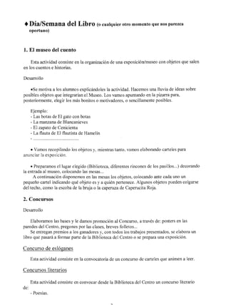 Este documento proporciona varias actividades para promover la lectura entre estudiantes. Incluye ideas como organizar un museo con objetos de cuentos famosos, concursos literarios y de ilustraciones, exhibiciones de libros, visitas a bibliotecas, festivales literarios y talleres durante la Semana del Libro. El objetivo general es motivar a los estudiantes a leer a través de actividades prácticas y creativas relacionadas con libros y cuentos populares.