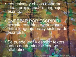 El documento describe las etapas progresivas del aprendizaje del lenguaje escrito en los niños, comenzando con la relación entre el lenguaje oral y escrito, y progresando desde garabatos y pseudoletras hasta la escritura convencional con letras y silabas. Reconoce que cada niño aprende de manera diferente dependiendo de sus experiencias previas, y enfatiza crear un ambiente positivo que refuerce la autoestima a través de la formulación de preguntas, la comprobación de hipótesis, y el enfo