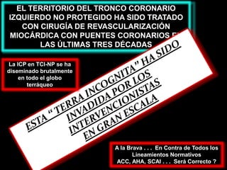 Este documento discute la revascularización del tronco coronario izquierdo no protegido (TCI-NP) mediante cirugía de puentes coronarios versus intervención coronaria percutánea (ICP) con stents liberadores de fármacos. Los lineamientos actuales recomiendan la cirugía como tratamiento de primera línea para el TCI-NP. Sin embargo, varios estudios recientes muestran que la ICP con stents liberadores de fármacos puede tratar con éxito lesiones del TCI-NP con bajas tasas de mortalidad, infart
