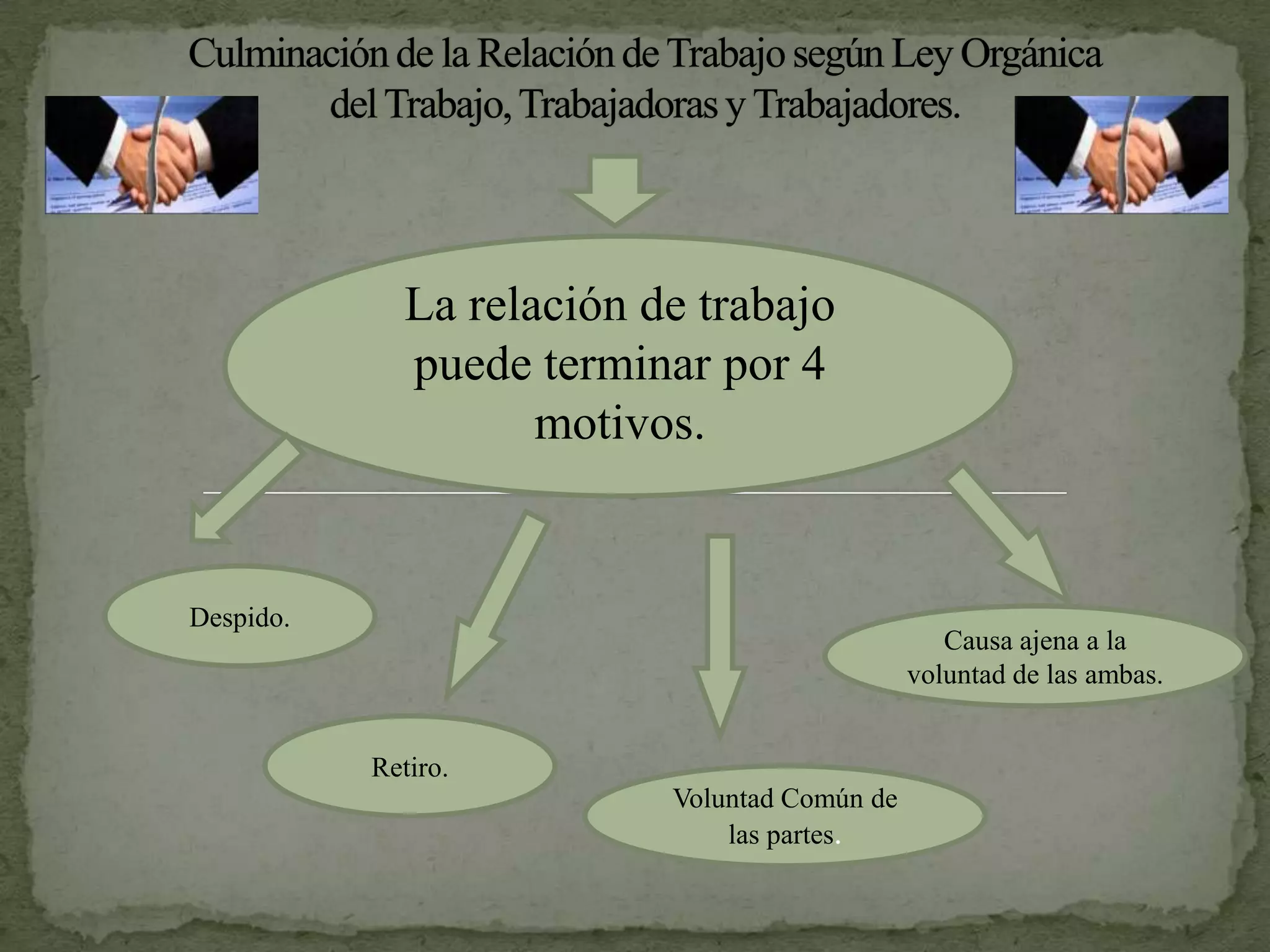 La relación de trabajo puede terminar por 4 motivos: 1) Despido, que es causado por razones ajenas a la voluntad de ambas partes; 2) Retiro, que ocurre por acuerdo mutuo de las partes; 3) Despido injustificado; y 4) Despido justificado, que involucra causas atribuibles al trabajador.