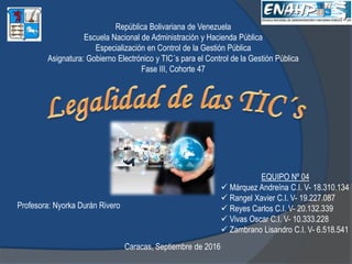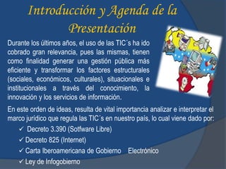 El documento resume el marco jurídico de las TIC en Venezuela, incluyendo el Decreto 3.390 sobre software libre, el Decreto 825 sobre el uso de Internet, la Carta Iberoamericana de Gobierno Electrónico, y la Ley de Infogobierno. El objetivo es analizar estas leyes y decretos para establecer un modelo de desarrollo basado en principios constitucionales que facilite una gestión pública eficiente a través del uso de tecnologías de información.