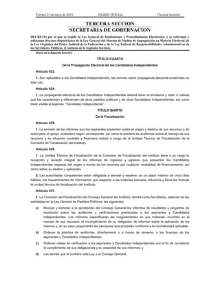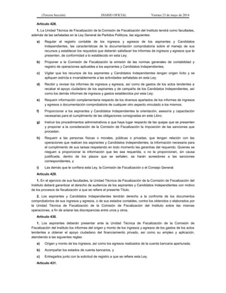 Este documento establece las normas para la fiscalización y propaganda electoral de candidatos independientes en México. Se crea una Unidad Técnica de Fiscalización que revisará los informes de ingresos y gastos de los candidatos independientes. También se establecen reglas para la documentación y materiales electorales de candidatos independientes, así como para el cómputo de votos para este tipo de candidatos.