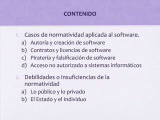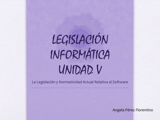 Este documento resume la legislación y normatividad actual relativa al software en México. Explica que el software está protegido por la propiedad intelectual, incluyendo los derechos de autor. También describe los diferentes tipos de licencias de software y las leyes que regulan y sancionan la piratería y falsificación de software.
