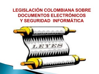 Este documento presenta la legislación colombiana sobre documentos electrónicos y seguridad informática. Explica las principales leyes que rigen la validez jurídica de los documentos electrónicos en Colombia, incluyendo la Ley 527 de 1999 sobre comercio electrónico. También describe elementos clave de la seguridad informática como la integridad, confidencialidad y disponibilidad de la información, así como proyectos de ley relacionados con firmas digitales y certificados electrónicos.