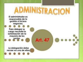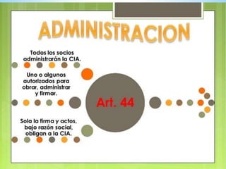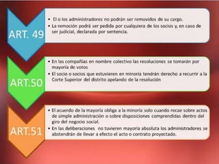 El documento contiene información sobre varios aspectos legales relacionados con las compañías en Perú. Explica que los empleados que reciben una parte de las utilidades no son considerados socios, y que un socio es responsable de indemnizar daños causados intencionalmente a la compañía. También establece que el ejercicio económico de las compañías termina cada 31 de diciembre y describe los procedimientos y requisitos para la transformación de una compañía en otra figura jurídica.