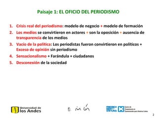 Este documento discute la necesidad de nueva legislación en comunicación para abordar los cambios en los medios, la tecnología y la sociedad. Presenta cuatro panoramas clave: 1) la crisis del periodismo, 2) el papel cambiante de los políticos, 3) los derechos a la información y comunicación, y 4) las razones para una nueva legislación. Argumenta que la ley debe promover la libertad de prensa, diversidad mediática, derecho a la comunicación ciudadana, y fomentar contenidos y periodismo de calidad para mejor