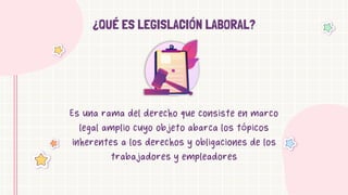 Este documento contiene información sobre la legislación laboral en Perú. Define la legislación laboral como el marco legal que regula los derechos y obligaciones de trabajadores y empleadores. Explica que existen dos ramas: individual, que se ocupa de derechos individuales como licencias y sueldos, y colectiva, que involucra derechos sindicales. También enumera elementos fundamentales como la remuneración, prohibición del trabajo infantil y no discriminación.