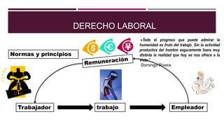 El documento resume los principios y normas laborales más importantes en Colombia. Estos incluyen la libertad de trabajo, la obligatoriedad del trabajo, la protección del trabajo, la igualdad de derechos, la primacía de la realidad sobre formalidades, la estabilidad laboral, la favorabilidad, y la irrenunciabilidad de beneficios mínimos. También describe mecanismos de garantía de derechos laborales como el derecho de petición, la acción de tutela, y la conciliación y transacción laboral.