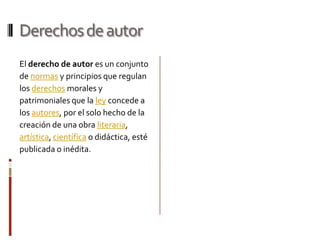 El documento habla sobre tres tipos de propiedad intelectual: derechos de autor, patentes y propiedad intelectual. Los derechos de autor regulan los derechos morales y patrimoniales de los autores sobre sus obras. Una patente otorga el derecho exclusivo de explotar una invención por 20 años. La propiedad intelectual incluye invenciones, obras literarias y artísticas, marcas y el registro provee protección administrativa sobre estas creaciones.